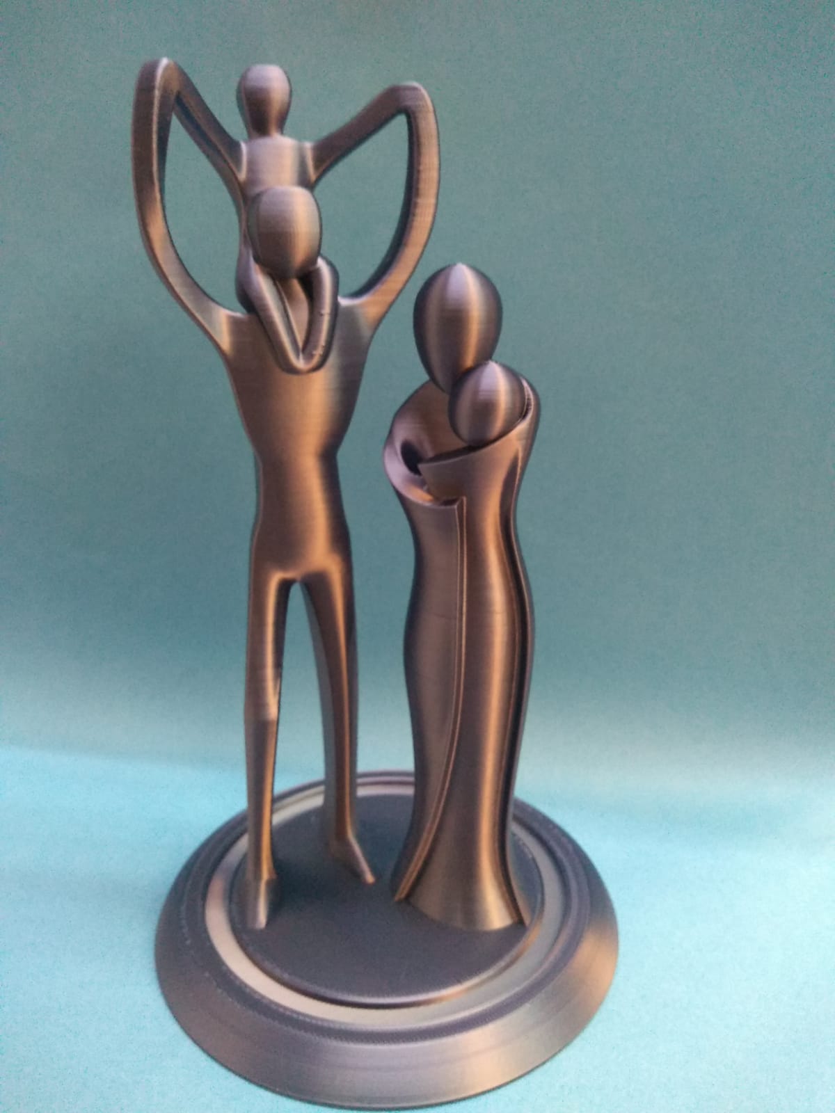 A peça em PLA azul retrata uma cena encantadora e familiar, com a mãe segurando um bebê e o pai carregando um filho nos ombros. A imagem transmite uma sensação de harmonia e união, representando uma família que está em sintonia e que compartilha momentos de felicidade.